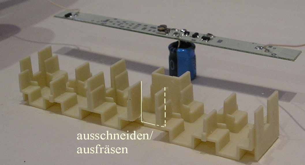 Wageninnenbeleuchtung für Personenwagen „Donnerbüchse“ neu Bi 29 (Fa. Tillig)(passend für die neue Ausführung mit Inneneinrichtung und geschlossener Bühne), Tillig Art.-nr. 13001/ 13002) Lichtfarbe gelb/ sgwTechnische Daten: klick oben ![]() Information: Beide Bausätze (Analog- und Digitalplatine) wurden speziell für den Einbau in Modellfahrzeuge Spur TT entwickelt und für diesen Wagen angepasst. Durch Einsatz moderner Bauelemente ist der Stromverbrauch äußerst niedrig. Die Helligkeit der Beleuchtung ist einstellbar und bleibt konstant. Der Einsatz eines Stützkondensators in Verbindung mit superhellen LEDs vermindert das Flackern und Aussetzer erheblich. Achten Sie trotzdem auf eine gute Stromaufnahme durch saubere Räder. Einbau/ Anschluss: Die Leiterplatte liegt auf der Inneneinrichtung. Bei der Analogvariante bestimmt der Stützkondensator den Einbauort. Bei der Digitalvariante ist der Kondensator natürlich auch im Abort plaziert, muss aber nachträglich angeschlossen werden. Empfehlenswert ist, die Inneneinrichtung der Wagen farblich zu gestalten. (Fußboden braun, falls Sie weiße LEDs einsetzen, die Sitze holzfarben). Die Stromaufnahme erfolgt im einfachsten Fall von den Blechlagerbügeln. Eine weitere Verbesserung der Stromaufnahme wird unter der Rubrik Tipps beschrieben. Die Abortwände sind nach Einbauanleitung so zu kürzen, dass der Kondensator dort Platz hat. Falls Sie die Analog-Beleuchtung abschaltbar machen wollen, können Sie an geeigneter Stelle im Wagenboden einen kleinen Stecker mit Jumper (Einzelteile E0050) einbauen.
