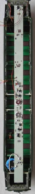 Bild: C4i-30 der DR, EP III mit B262A (12 LEDs goldenweiß) + Schlusslaternen (B1550) Information: Beide Bausätze (Analog- und Digitalplatine) wurden speziell für den Einbau in Modellfahrzeuge Spur TT entwickelt und für diesen Wagen angepasst. Durch Einsatz moderner Bauelemente ist der Stromverbrauch äußerst niedrig. Die Helligkeit der Beleuchtung ist einstellbar und bleibt konstant. Der Einsatz eines Stützkondensators in Verbindung mit superhellen LEDs vermindert das Flackern und Aussetzer erheblich. Achten Sie trotzdem auf eine gute Stromaufnahme durch saubere Räder. Einbau: Die Leiterplatte liegt über der Inneneinrichtung und wird durch den Kondensator platziert. Alle LEDs sind etwa mittig über den Fenstern angeordnet. Eine zuverlässige Stromzuführung wird durch dünne Dekoderlitze von den Lagerblechen durch den Wagenboden hergestellt. Zum Einbau werden die Rohrniete einschließlich der übergroßen Plastummantelung entfert. Die Kulissenführung kann an den Fahrzeugboden angeklebt werden oder über M2-Schraubverbindung gehalten werden. Der Wagenkasten wird mit z.B. Hin & Weg ausreichend fest mit dem Fahrgestell verbunden. Eine farbliche Gestaltung der Inneneinrichtung verbessert den Eindruck noch weiter. Nun fehlen nur noch die Reisenden. Falls Sie die Analog-Beleuchtung abschaltbar machen wollen, können Sie an geeigneter Stelle im Wagenboden einen kleinen Stecker mit Jumper (Einzelteile E0050) einbauen. Lieferumfang: - 1 Beleuchtungsleiterplatte (geprüft und voreingestellt) Optionen: Auf jeder längeren Lichtleiterplatte ist eine unabhängige 2. Elektronik für Schlusslichter bestückbar. Die Helligkeit ist getrennt von der Innenbeleuchtung einstellbar und konstant. Betrieb nur bei Vorwärtsfahrt. Nachleuchtdauer ca. 5 Minuten. (B 0303 Aufpreis 9,00 € inkl. Goldcap) (In der Digitalausführung können die OWaLas (LEDs) direkt an dafür vorgesehenen Pads angeschlossen werden). links ist die Analogleiterplatte mit Schlusslichtelektronik abgebildet Anmerkung: ![]() Schlusslaternen (M 1:120) Nr. 1550 bitte extra bestellen Bezug und Information: - Bestellung auf www.MoBa-Licht.de m= 4 g Falls Sie die Beleuchtung nicht selbst einbauen wollen oder können, den Kompletteinbau übernehme ich auch. Lassen Sie sich ein Angebot erstellen. |