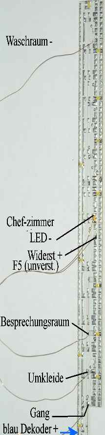 Information: Diese Bausätze wurden speziell für den Einbau in den Hilfszug der DR, für Mannschaftswagen, Gerätewagen bzw. Energieversorgungswagen für die Spur TT entwickelt. Durch den Einsatz moderner Bauelemente ist der Stromverbrauch meiner Beleuchtungen bekanntermaßen äußerst niedrig. Hier soll für ein Spitzenprodukt der Fa. Tillig eine Erweiterung, die die derzeitigen Möglichkeiten der Technik in etwa ausschöpft, gezeigt werden. Ich bin davon ausgegangen, dass in die Steuerwagen sowieso ein Dekoder eingesetzt wird. Folglich sind die Lichtleisten dafür (Anschluss an den Digitaldekoder) angepasst. Die Licht-LP des Gerätewagens hat einen integrierten Dekoder. An 2 freien Ausgängen lassen sich die Außenlampen anschließen und damit unabhängig schalten und dimmen. Die Möglichkeiten: Zum Eisatz kommt der Steck-Funktionsdekoder MX 680 (Zimo). Natürlich kann auch jeder andere Funktionsdekoder (z.B. Kress) mit Abstrichen an dem Funktionsumfang eingesetzt werden. Die Funktionen im Einzelnen: F 0vorwärts = Ausgang Licht weiß, F 0rückwärts = Ausgang Schlusslicht, F1 = FA1 ... Besprechungsraum, F2 = FA2 ... 2. Raum und Umkleide, F3 = FA3 … Gang, F4 = FA4 … Waschraum, F5 = FA5 … Chefzimmer, dazu CV 124 auf 128 setzen F6 = FA6 … Führerstand, (FA5 und FA6 werden als TTL-Ausgang direkt benutzt und mit 0,8 mA bei 5 V belastet). Da der Nachfolger des o.g. Dekoders nur noch 6 verstärkte Ausgänge (MX 671N) hat, werden jetzt die für FA5 und FA6 vorgesehenen LEDs für verstärkte Funktionsausgänge ausgestattet und können an einen beliebigen anderen Funktionsausgang mit angeschlossen werden. Einbau: Da die vorhandene Stromversorgung des Wagens sehr gut funktioniert, wird sie auch genutzt. Die Leiterplatte liegt über den Stegen des Wagenkastens.Die LED-Aufteilung ist hier so gestaltet, dass nicht gefäst werden braucht. ![]() Optionen: Trotz guter Stromaufnahme ist es sinnvoll am Dekoder ein Speicherbaustein anzuschließen. Die Kondensatorbaugruppe nach einem Schaltungsvorschlag des Dekoder-Herstellers. ![]() links ist die Leiterplatte für den Mannschaftswagen abgebildet Lieferumfang: - 1 Beleuchtungsleiterplatte (geprüft) (die Kondensatorgruppe bitte extra bestellen) (die Außenlampen für Energieversorgungswagen und Gerätewagen bitte extra bestellen) Bezug und Information: - Bestellung auf www.MoBa-Licht.de Falls Sie die Beleuchtung nicht selbst einbauen wollen oder können, den Kompletteinbau übernehme ich auch. Lassen Sie sich ein Angebot erstellen. Wahrscheinlich schneller hier; - KöMo (René Köppe) |
