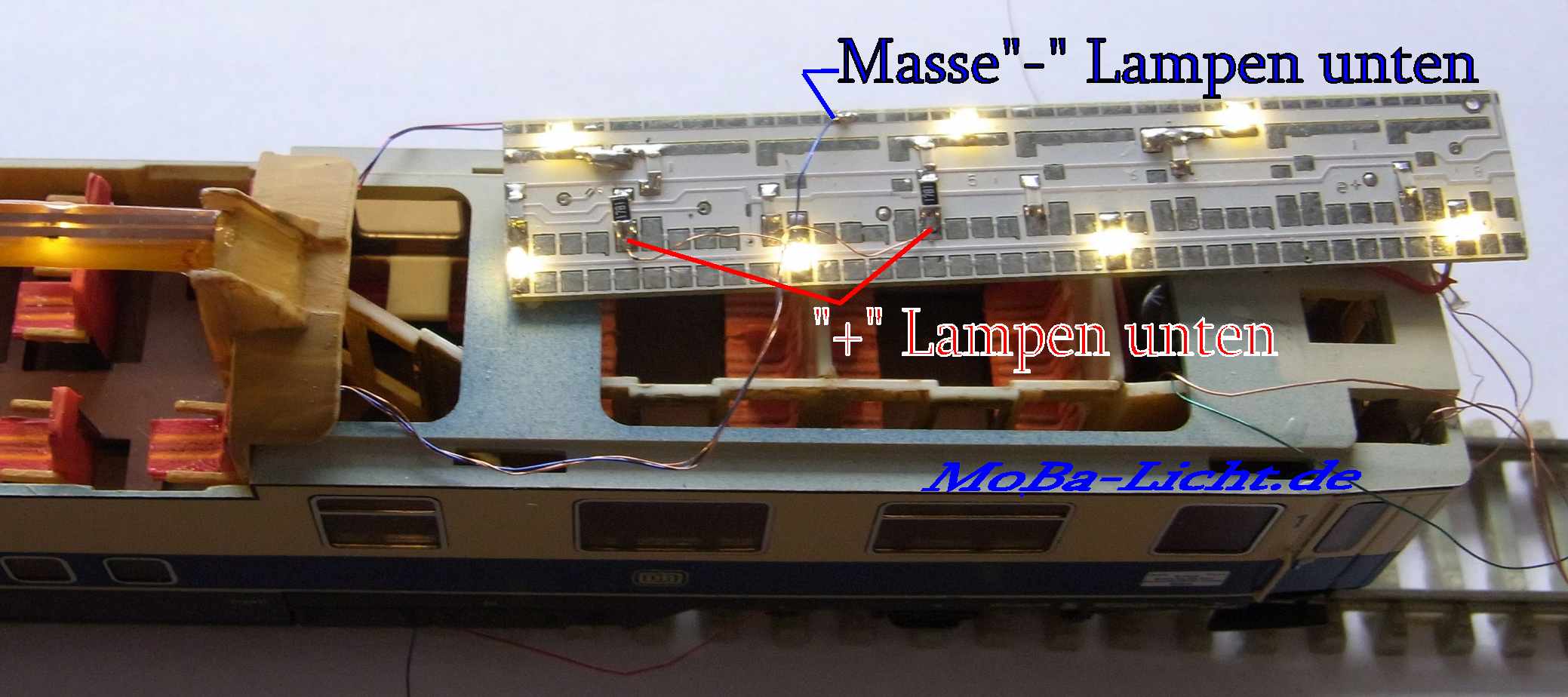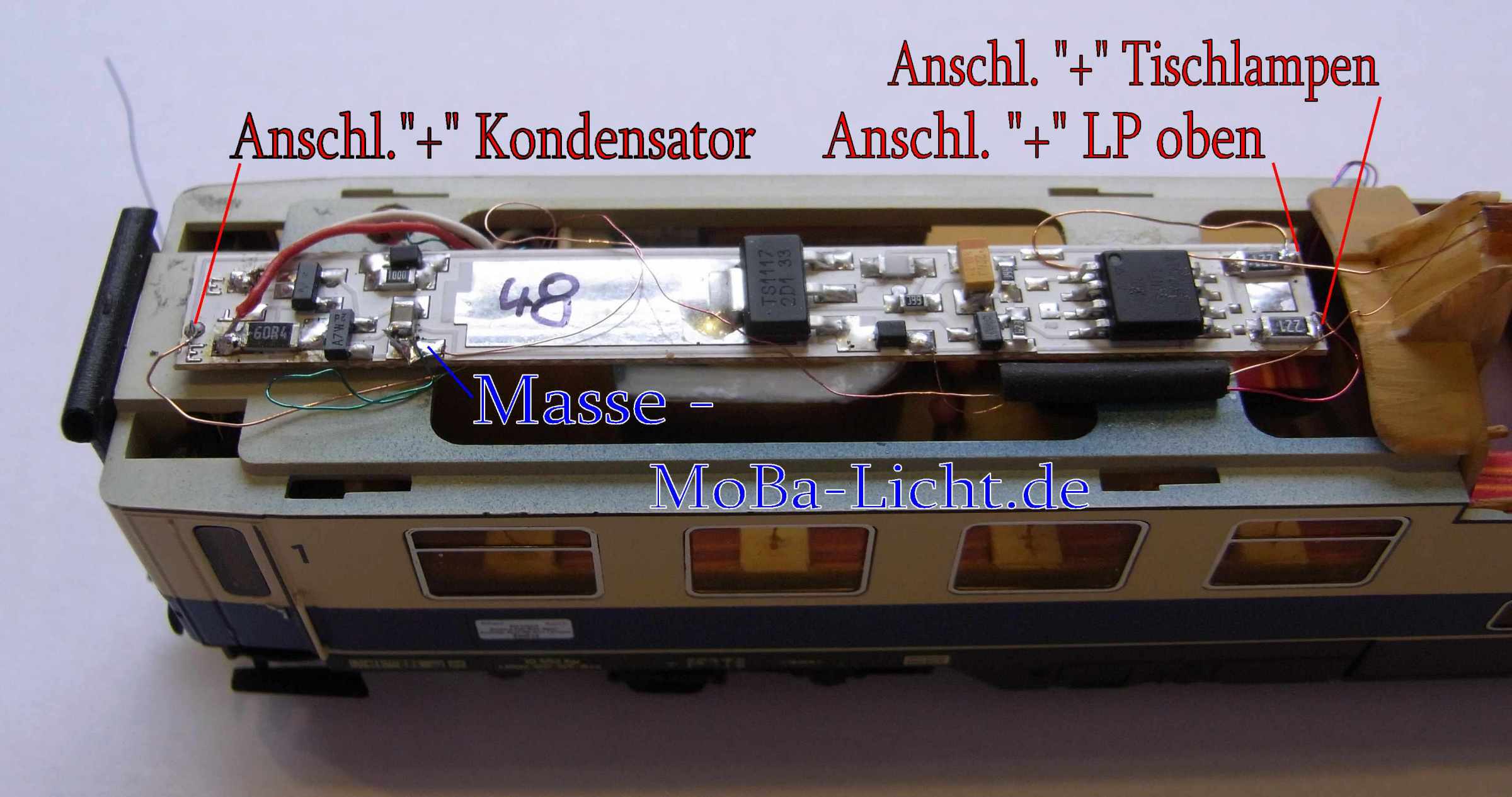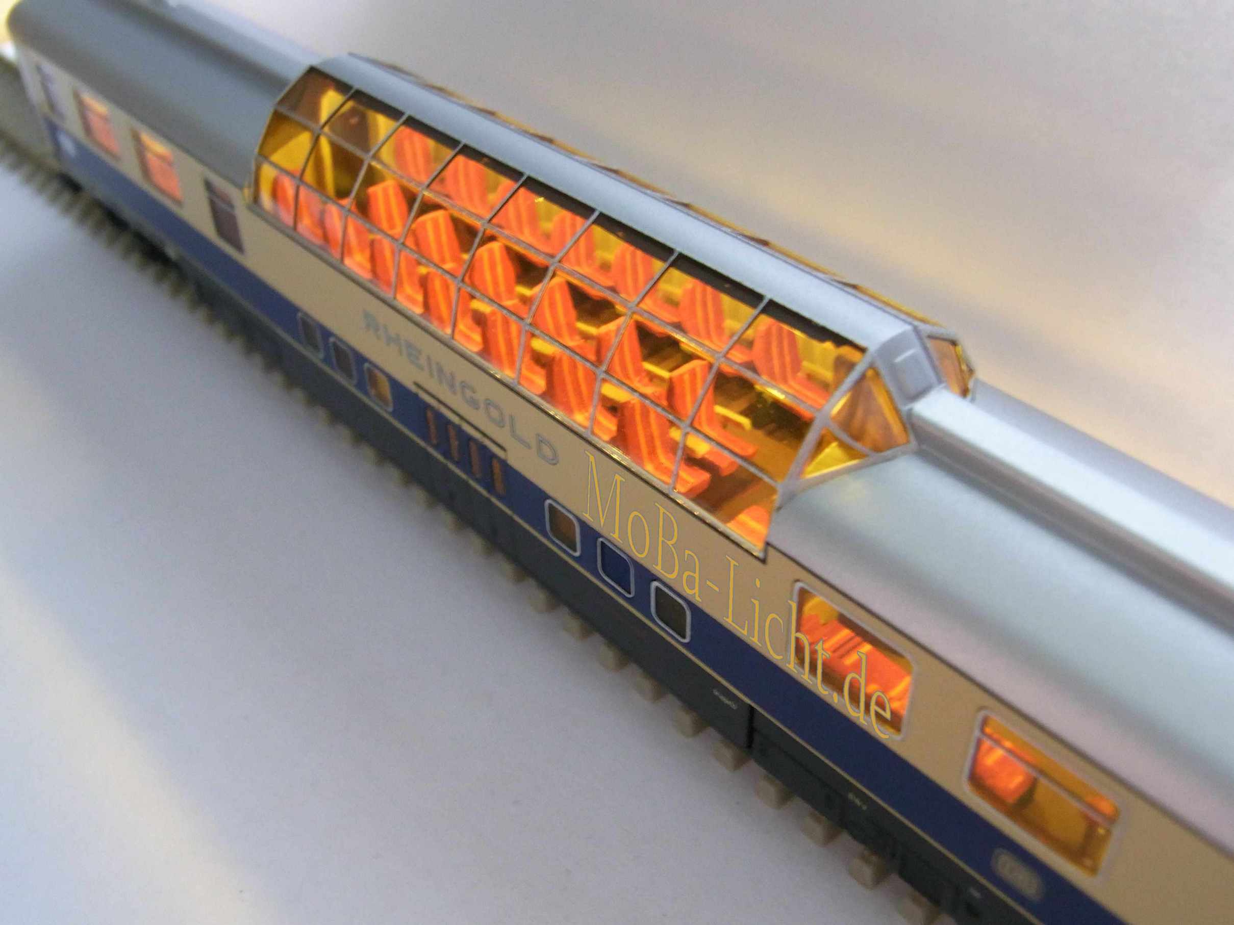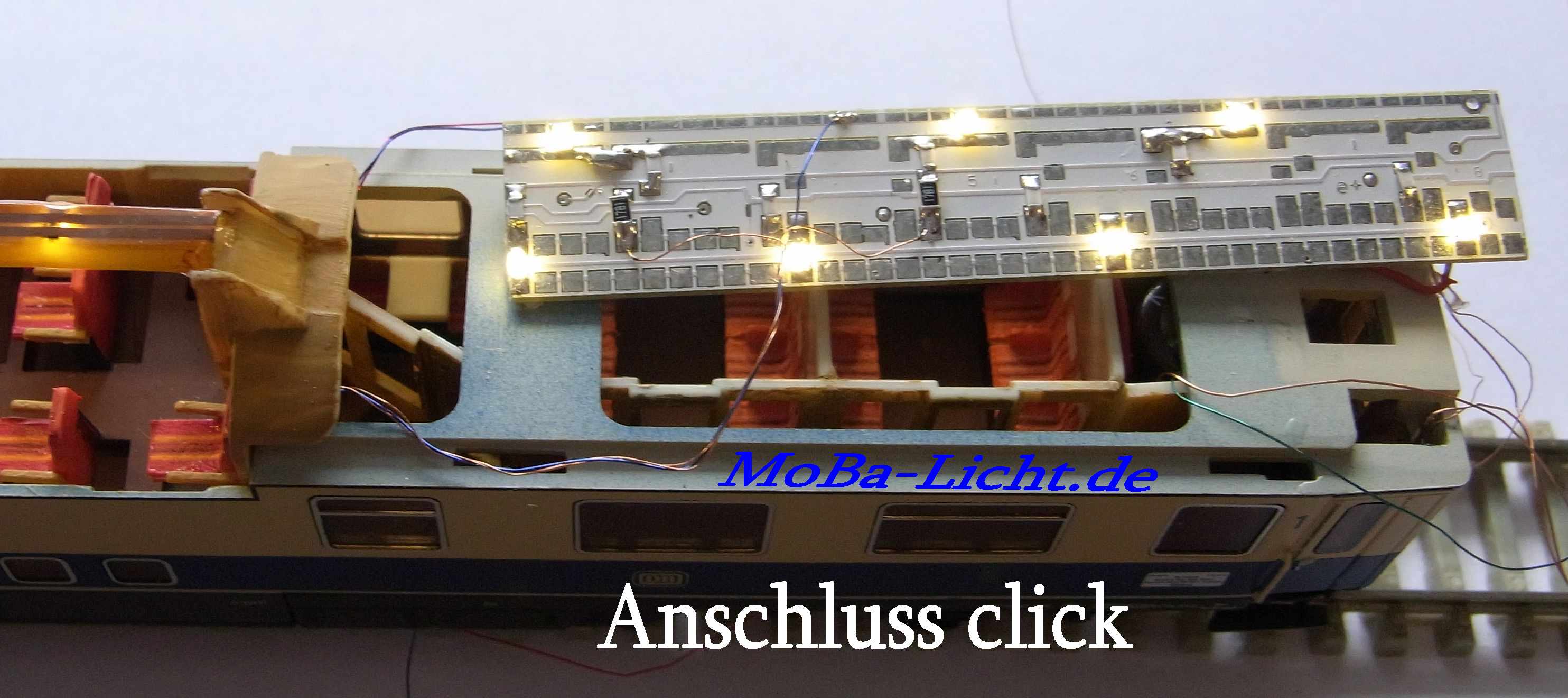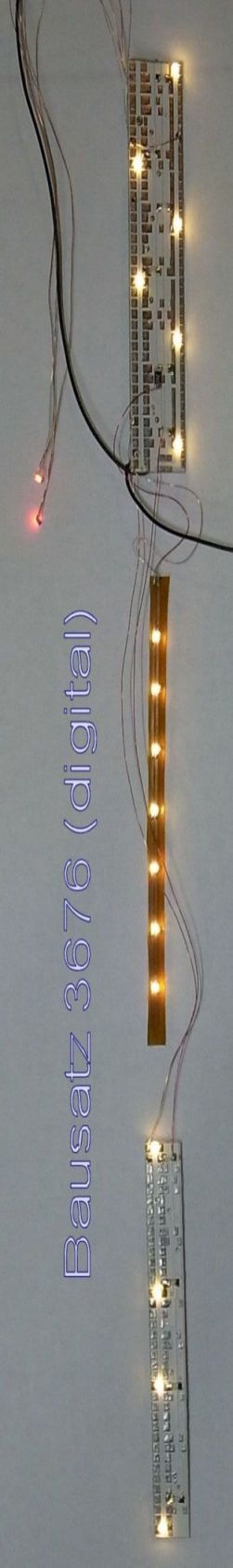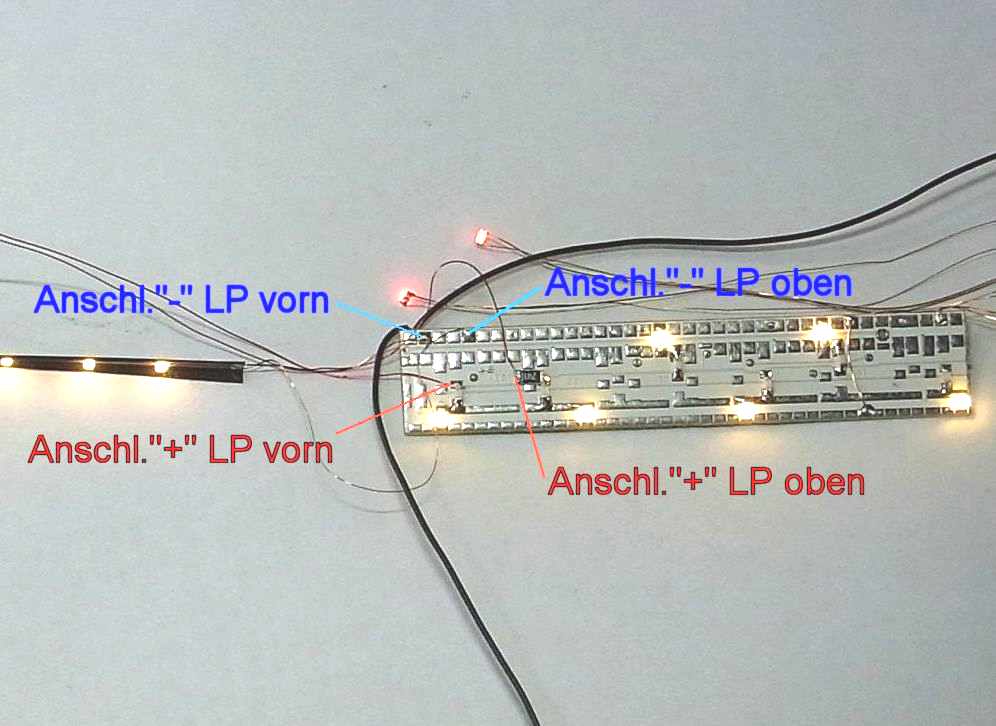 Wageninnenbeleuchtung für einen Rheingold Aussichtswagen (Fa.Tillig M 1:120)Lichtfarbe warmweiß; Technische Daten: klick oben![]() Information: Lieferbar sind 1 Analogvariante und 2 Digitalvarianten: Alle Varianten bestehen aus 2 kleinen LPs und einer speziellen Folien-LP (0,15mm dick) für den Aussichtsbereich. Die einfache Digitalvariante hat 3 getrennt schaltbare und dimmbare Ausgänge. Belegung: Software V46: Ausgang 3 (schaltbar mit F1) Innenbeleuchtung vorn, Aussichtsbereich, hinten Abteile und Gang Ausgang 2 (schaltbar mit F0 hinten) Schlusslicht, optional Ausgang 1 (schaltbar mit F2) Tischlampen, optional Die premium Digitalvariante hat 6 getrennt schaltbare und dimmbare Funktionen auf ein oder zwei Digitaladressen. Belegung: LP vorn Software V48: Ausgang 3 (schaltbar mit F1) Innenbeleuchtung vorn Ausgang 2 (schaltbar mit F2) Aussichtsbereich Ausgang 1 (schaltbar mit F3) Tischlampen, optional Software LP hinten V46: Ausgang 3 (schaltbar mit F4) Abteile hinten Ausgang 2 (schaltbar mit F9) Schlusslicht, optional Ausgang 1 (schaltbar mit F5) Gang hintenund untere Ebene Natürlich können alle Funktionen frei zwischen F0 und F12 aufgeteilt werden. Wenn mehrere Wagen mit der gleichen Digitaladresse betrieben werden sollen, empfehle ich das Schlusslicht nicht auf F0 zu legen. Durch den Einsatz modernster Bauelemente ist der Stromverbrauch äußerst niedrig. Der Einsatz eines Stützkondensators in Verbindung mit superhellen LEDs vermindert das Flackern und Aussetzer erheblich. Achten Sie trotzdem auf eine gute Stromaufnahme durch saubere Räder. Für die Digitalversion empfielt sich ein Umbau auf mittig isolierte Radsätze. Einbau: ![]() LP vorne (premium B3686) - Der Kondensator passt wieder in den Abort und ist von außen nicht mehr sichtbar. ![]() LP hinten (gedreht) Anschluss B3676 Ein noch besseres Aussehen erhält das Modell durch etwas Farbe auf der Inneneinrichtung. Keine Angst, die Streifen auf den Sitzen habe ich nicht gepinselt. Das kann ein Drucker besser. Sitze zum ausdrucken Lieferumfang: - 3 teiliger LP-satz vorangeschlossen - die Schlusslicht-LEDs und die Tischlampen gehören nicht zum BS, bitte separat bestellen, die Tischlampen sind leider noch nicht wieder lieferbar links ist die einfache Digitalversion abgebildet Bezug und Information: - Bestellung auf www.MoBa-Licht.de Falls Sie die Beleuchtung nicht selbst einbauen wollen oder können, den Kompletteinbau übernehme ich auch. Lassen Sie sich ein Angebot erstellen. |